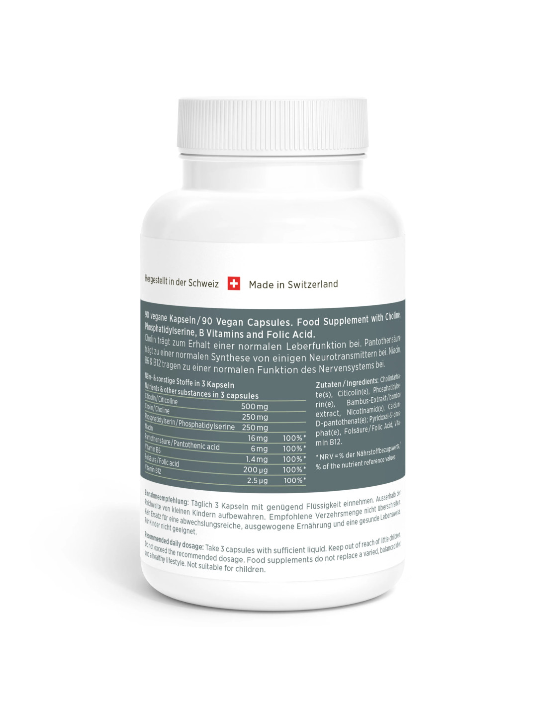 Jede Packung enthält 90 Kapseln, die eine Tagesdosis von 350 mg Cholin bereitstellen (bei einer empfohlenen Einnahme von 3 Kapseln). Die Herstellung erfolgt in einer Schweizer Produktionsstätte und garantiert so höchste Qualität.